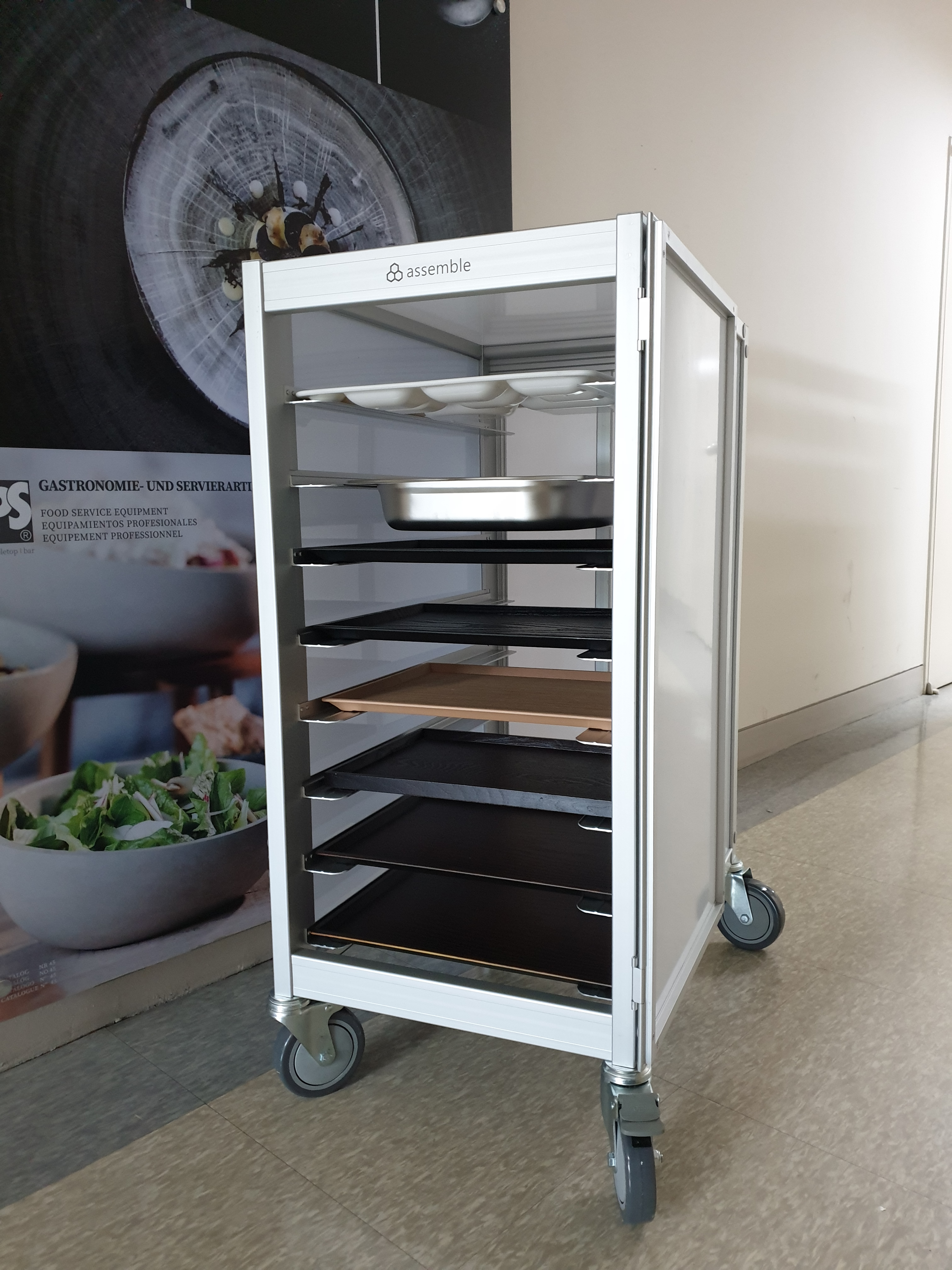 식당 배식, 퇴식 식기 반납, 배식용 반찬 세팅, 병원 배선 등 다양한 용도로 활용 가능한 캐비넷형 8단 시팬 카트입니다.