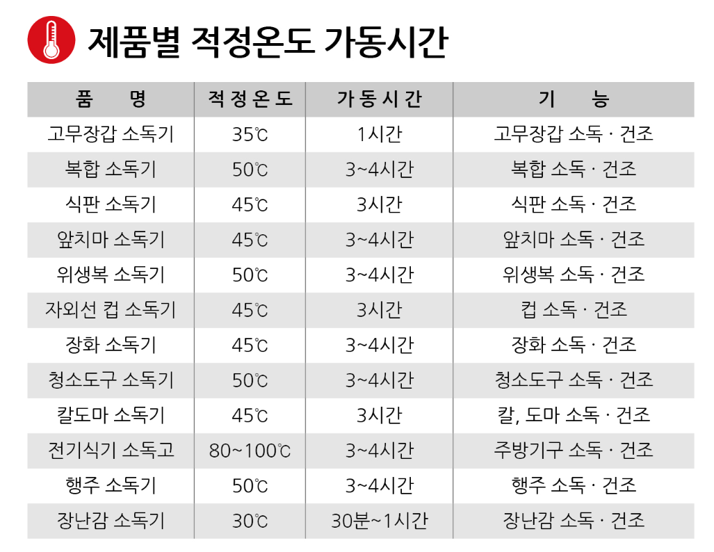 - 용량: 칼 12개, 900도마 8개, 고무장갑 15장, 행주 22장