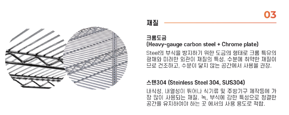 Chrome Plate(크롬도금)과 Stainless Steel 304(스테인리스304) 두 가지 재질로 나뉘며,