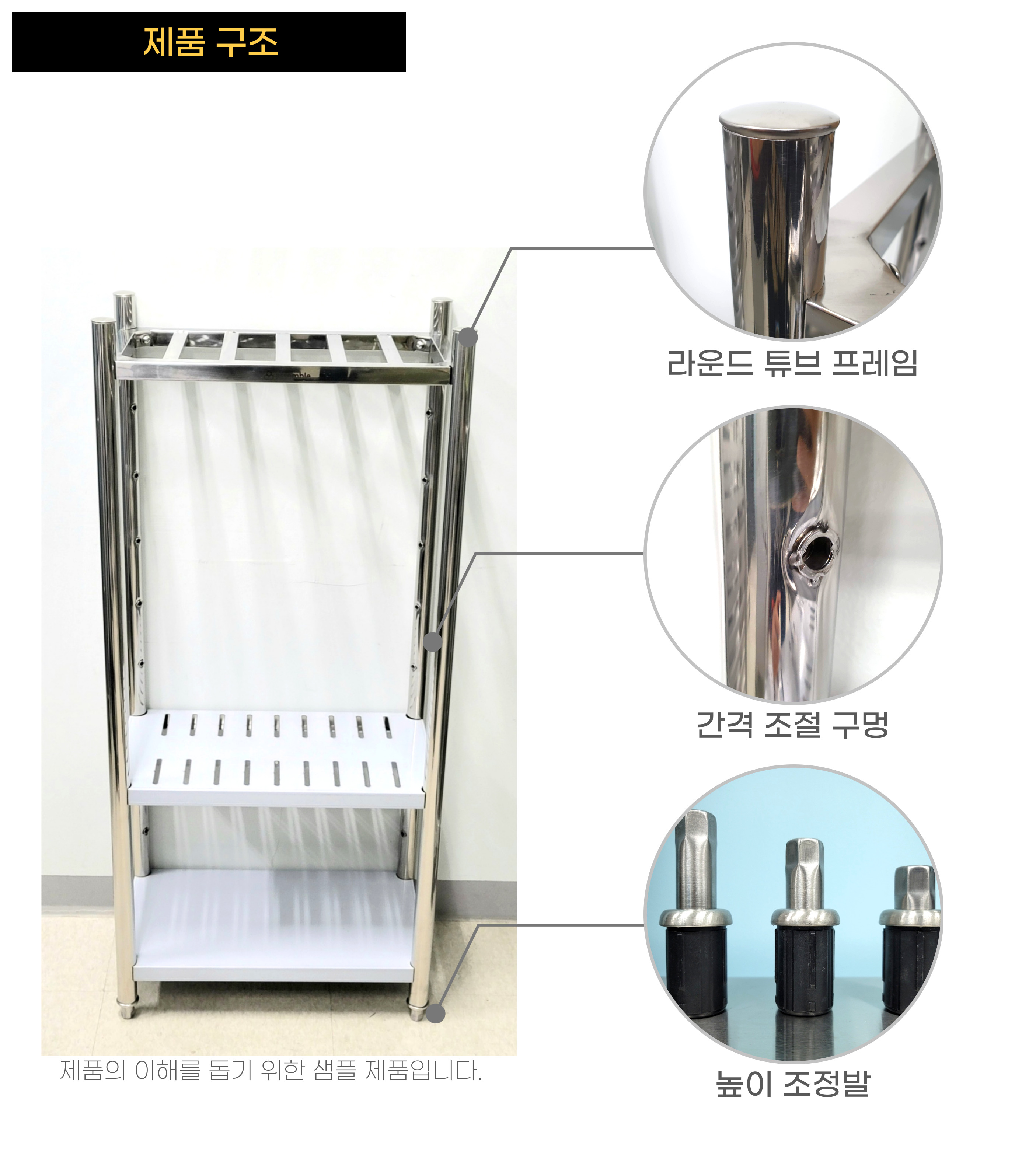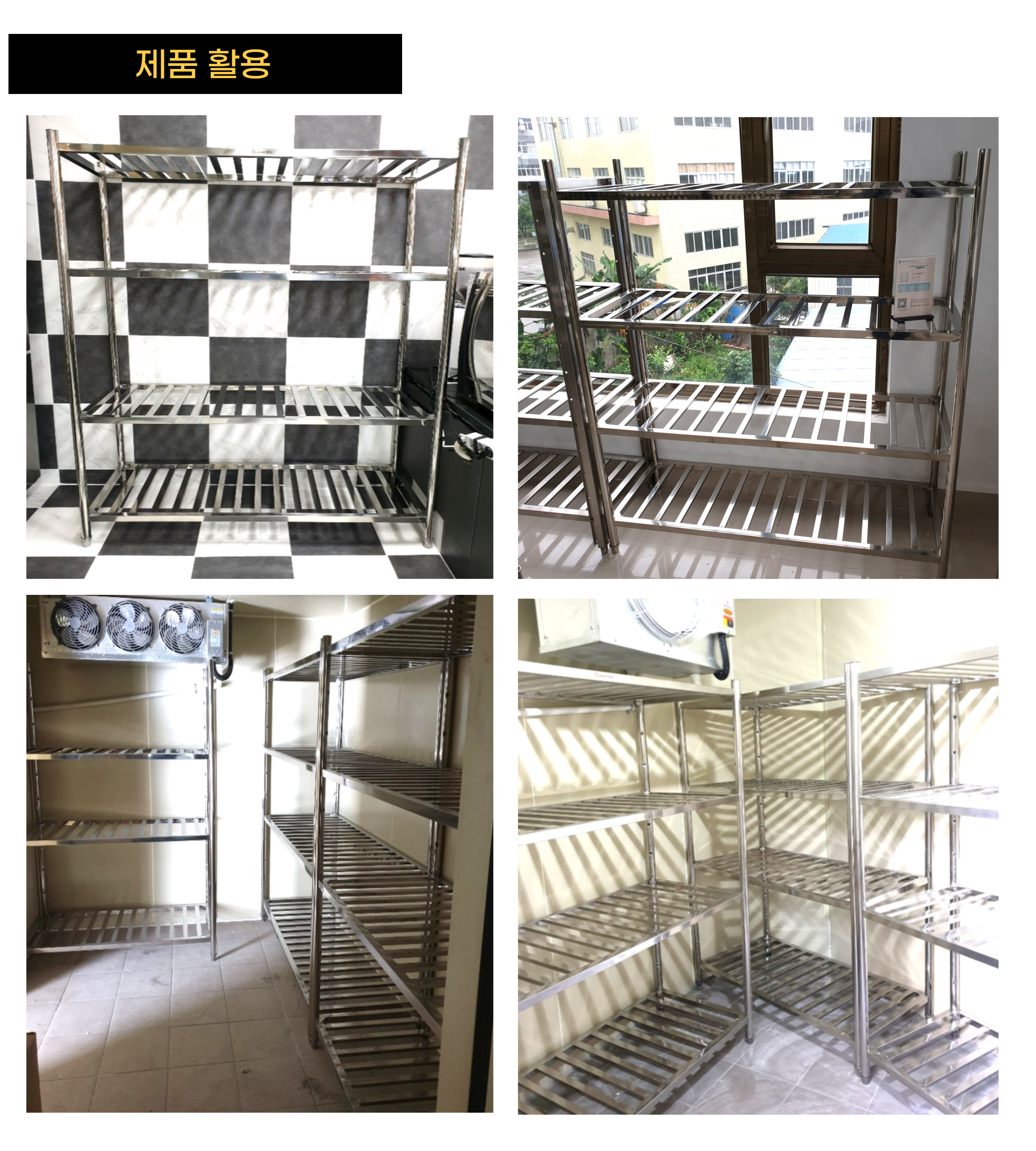 업소 창고, 냉동고, 주방 등의 식기 및 식자재를 적재 보관할 수 있는 다단식 선반입니다.