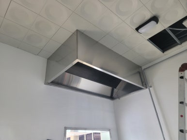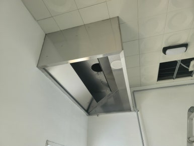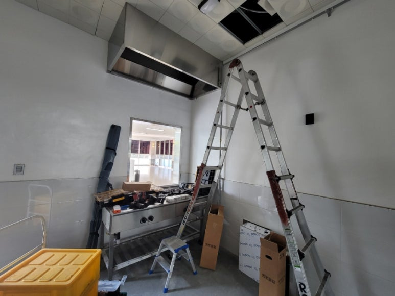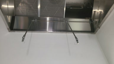 규정에 따라 장비(레인지 상판) 위에서 1200mm 이내에 노즐을 설치해야 했기 때문에, 후드의 높이에 맞춰 약재 분사 노즐이 아래로 길게 설치되었습니다.