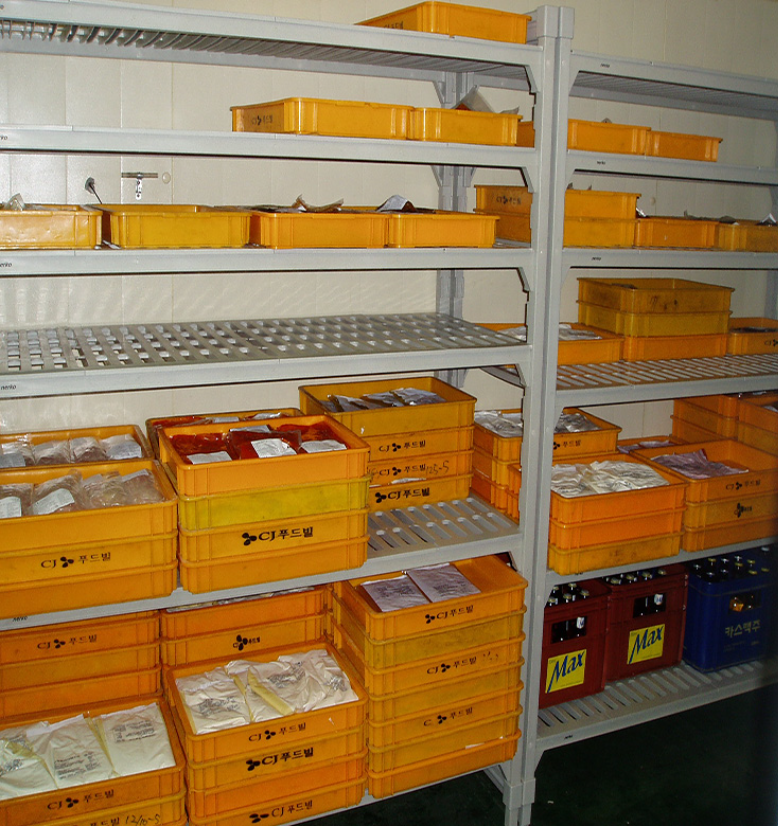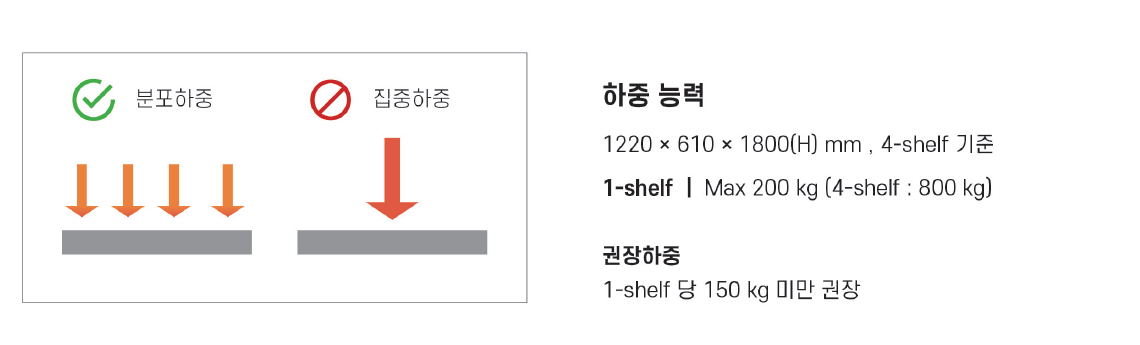 - 선반 단당 150~180kg까지 적재 가능