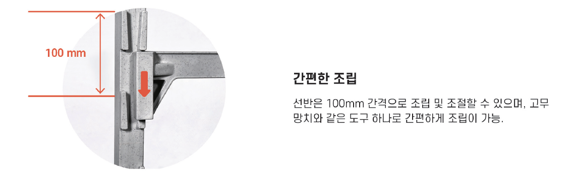 선반은 100mm 간격으로 조절할 수 있으며, 별도의 도구 없이 손쉽게 조립이